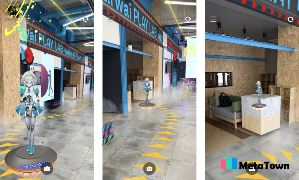 waiwai PLAY LABの施設の中を『MetaTown』(ダウンロード無料)のカメラでかざすと、現実の世界と仮想世界と融合した新たな景色を体感することができます。
