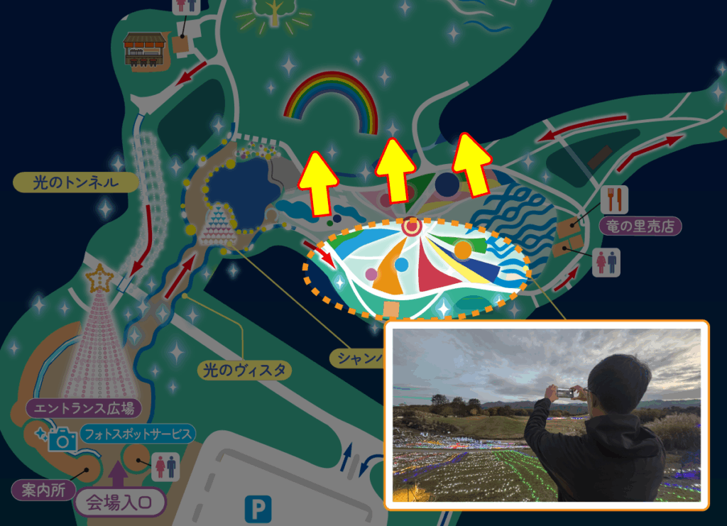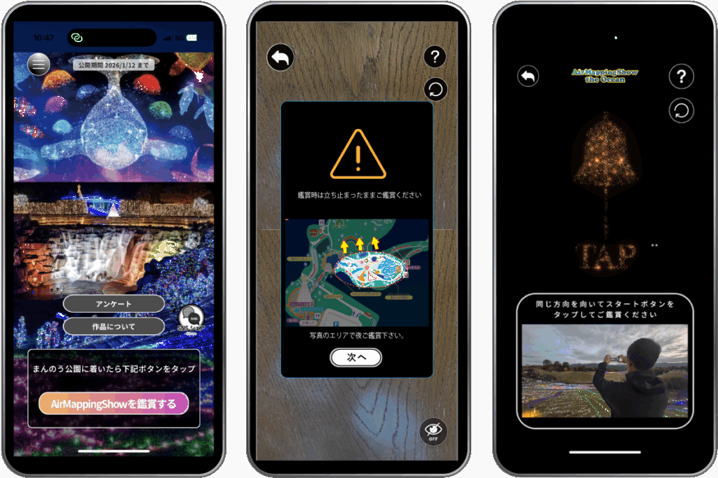 ダウンロード完了後は、ロビーページで[AirMappingShowを鑑賞]を選択し、体験場所を確認後、下部にある画像の方角に向き、ご鑑賞いただけます。