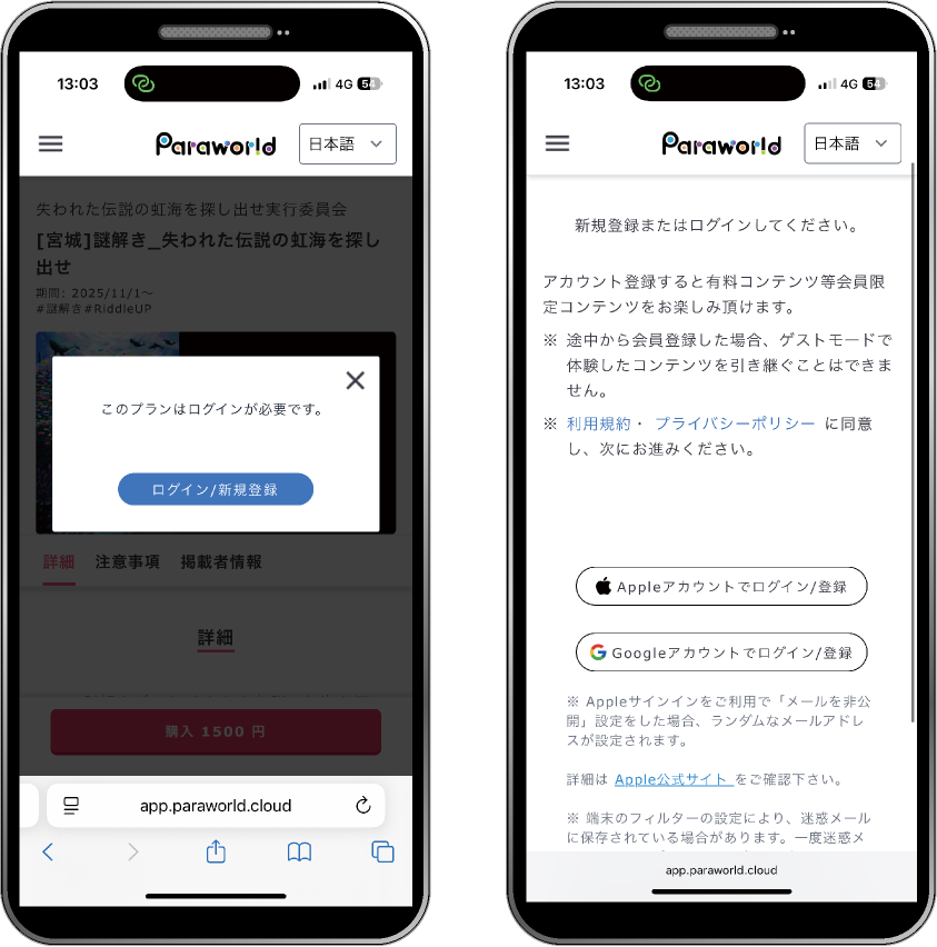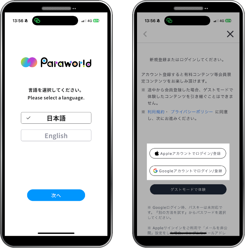 本体験には、体験時に使用するアプリ『Paraworld』のアカウント登録が必要です。Apple アカウントかGoogleで新規のアカウントを作成します。