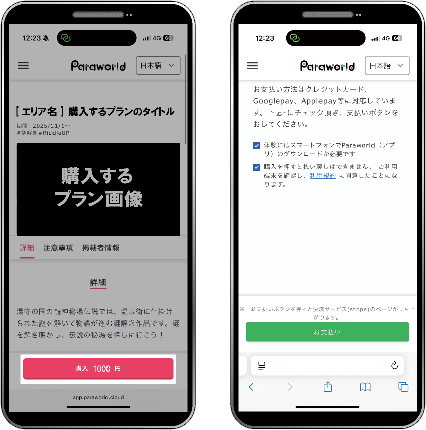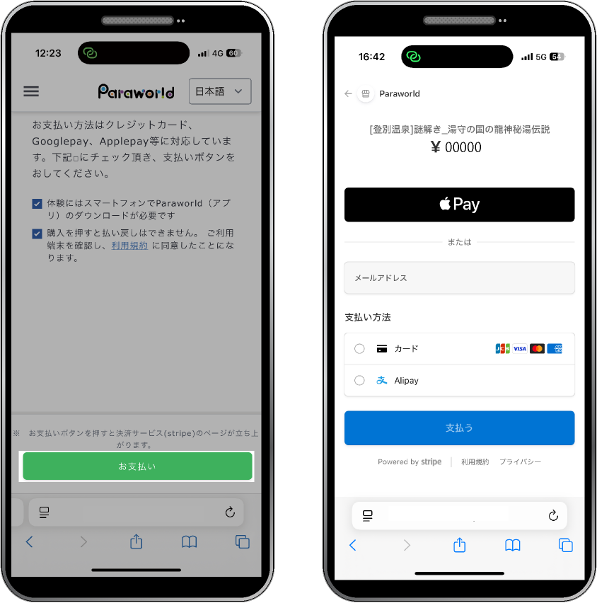 ログイン後、再度購入ページに移動します。購入ボタンをタップし、チェックボックスの規約に同意後[ お支払い] ボタンをタップします。