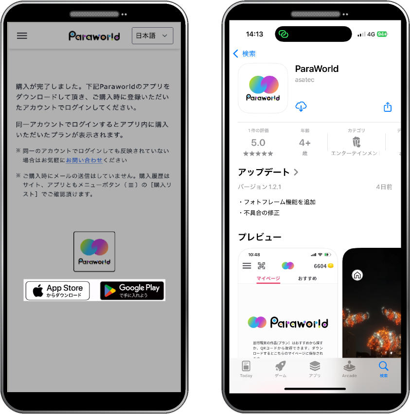 決済が終わると左のページに移動します。お手持ちの端末のストアボタンを選択しParaworld のアプリをダウン